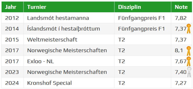 Bei der diesjährigen FIZO 2025 in Verden begeisterte Kóngur sowohl die Richter als auch das Publikum und qualifizierte sich für die WM in Dänemark. Für seine Proportionen erhielt er 9 Punkte, für seine Gliedmaßen sogar beeindruckende 9.5 Punkte. Bereits 2022 war er als vierjähriger Junghengst der höchstbeurteilte Hengst seines Jahrgangs in Dänemark.